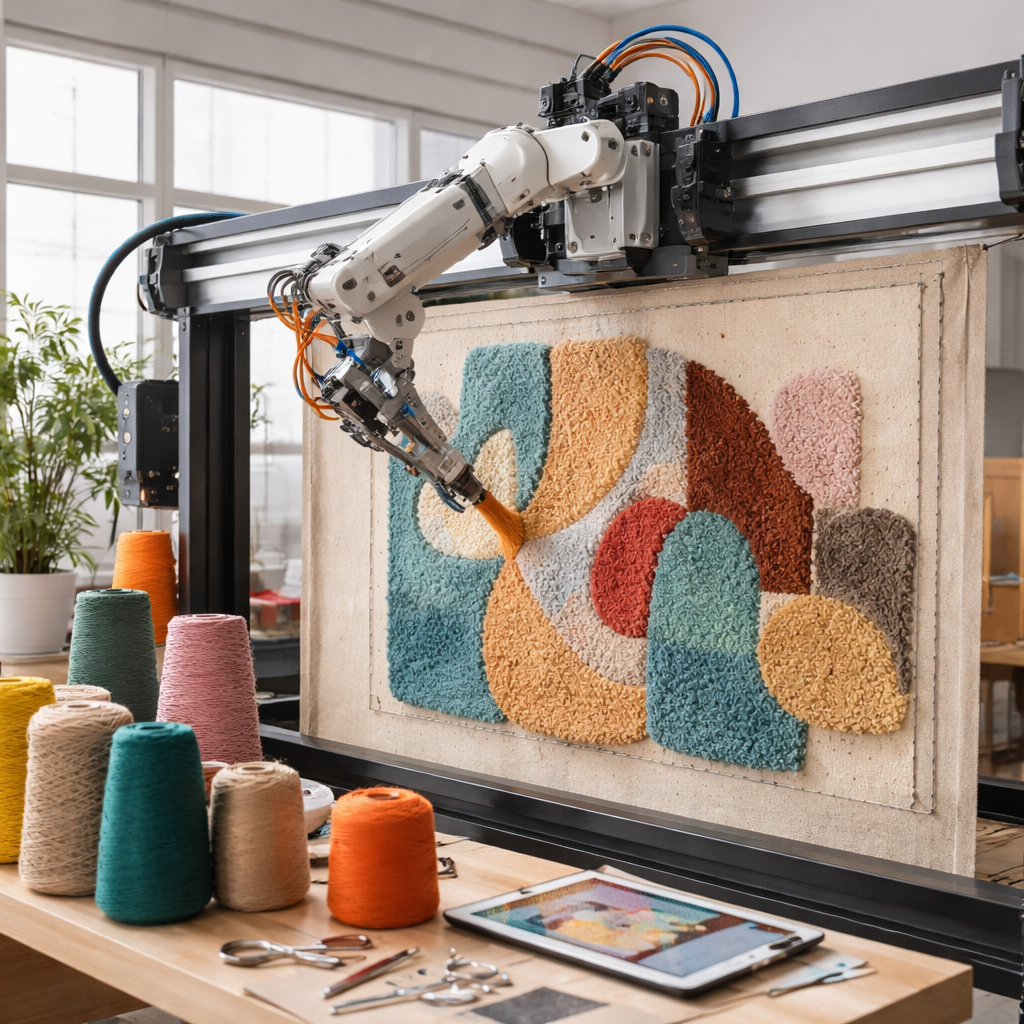 A: A robotic tufting machine is an automated system that inserts yarn into backing material based on a digital design. It helps textile startups produce rugs, wall art, and soft furnishings faster and more consistently.